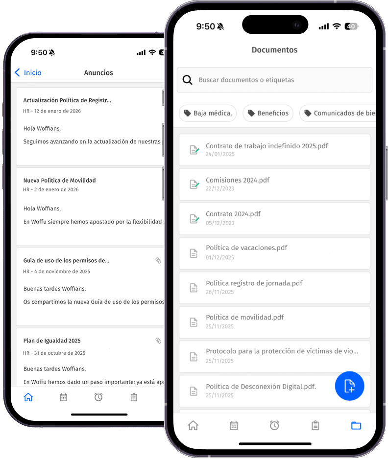 Centraliza documentos, agiliza firmas y mejora la comunicación con tus equipos. Woffu elimina procesos manuales y asegura que la información llegue a quien tiene que llegar, cuando tiene que llegar.