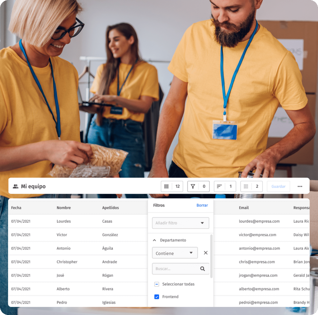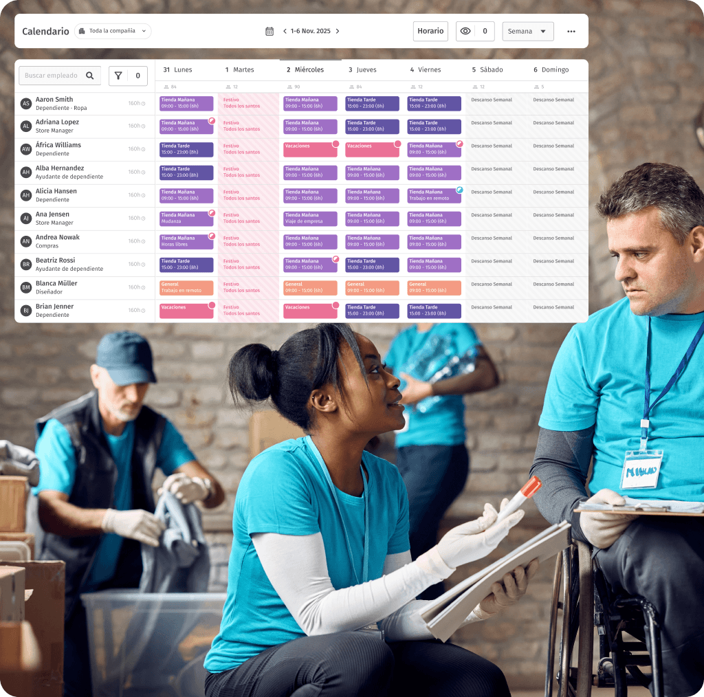 Visualiza dónde ficha tu equipo, organiza turnos y personaliza la plataforma según las necesidades de tu entidad social.